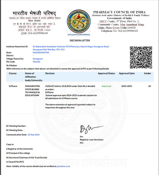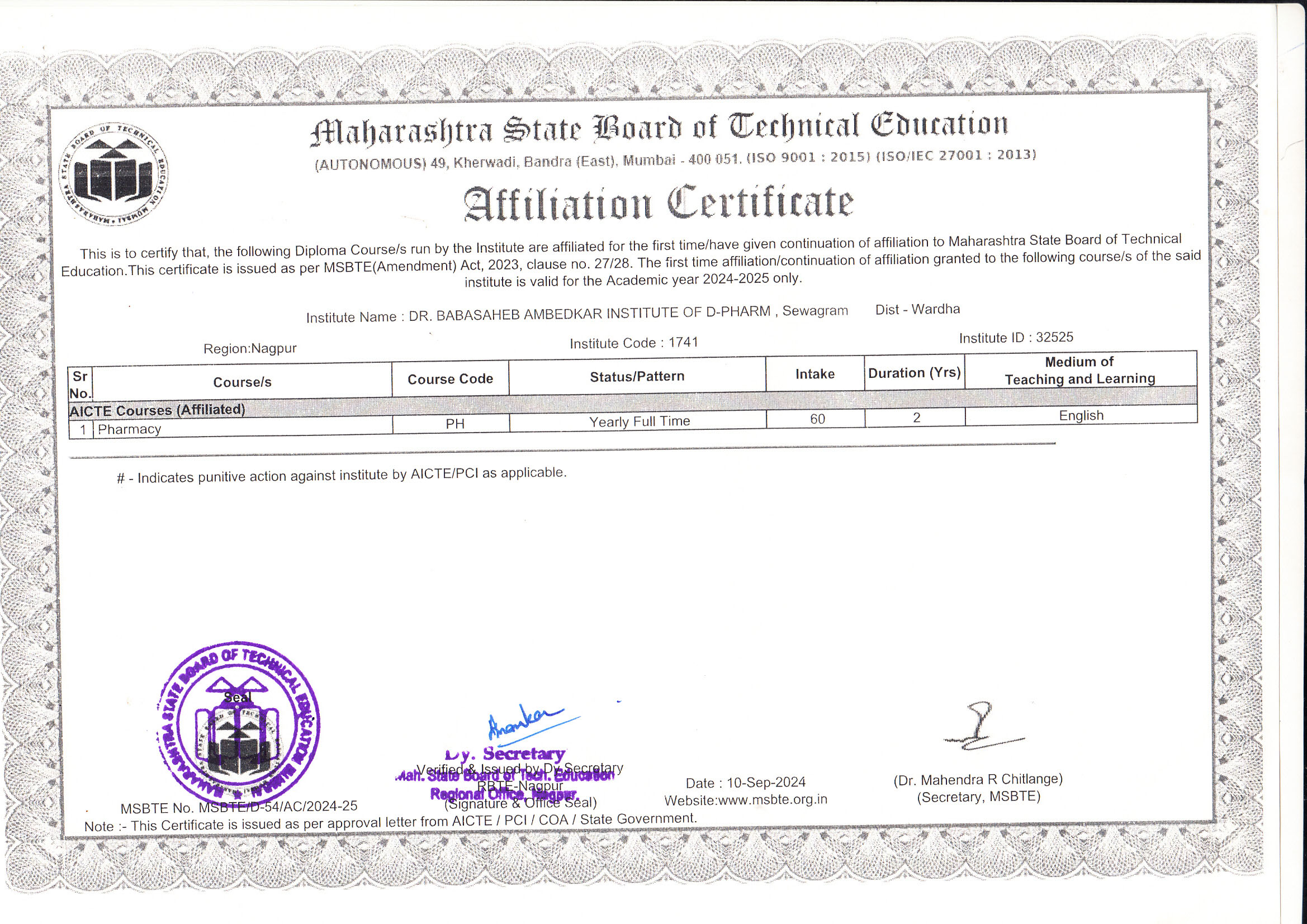 AFFILIATION 2024-2025Download DTEDownload MS GOVDownload PCI APPROVALS 2024-25Download Standard Inspection Form Fees Structure 2024-25